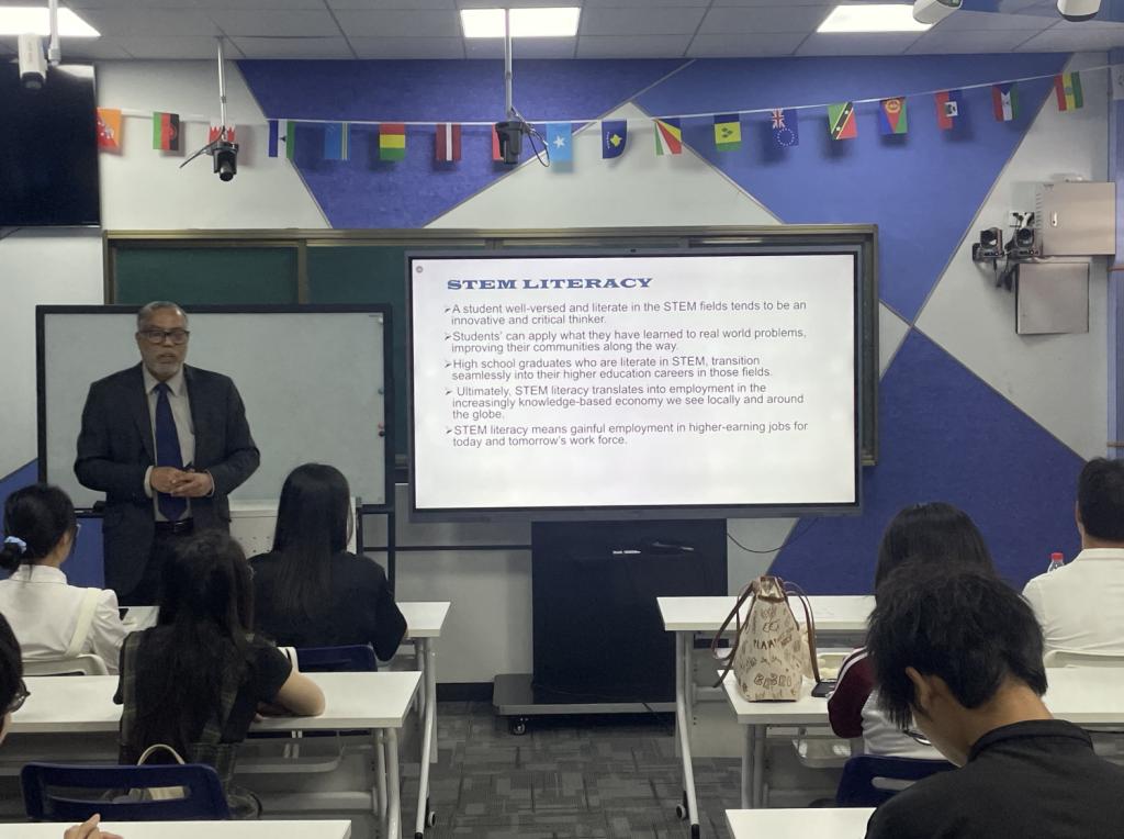 在信息科技突飞猛进的当下,为了让大学生认识到构建跨学科知识体系的重要性,了解最新的STEM(Science科学、Technology技术、Engineering工程、Mathematics数学)教育研究成果,2024年10月8日,williamhill中国官网国际学院与国际交流与合作处邀请墨尔本拉筹伯大学(La Trobe University Melbourne)的资深STEM学者Premnadh M Kurup博士来校开设“构建强大的知识体系以应对现实的多重变化 Cocreating Powerful Knowledge for Changes in Practice”讲座。国际学院回雁雁院长、张真副院长,以及来自国际学院、管理学院、教师教育学院、传播与传媒学院、外国语学院、人工智能学院、williamhill中国官网、文学院、健康医学院、会计学院的40多名大学生现场聆听了讲座。