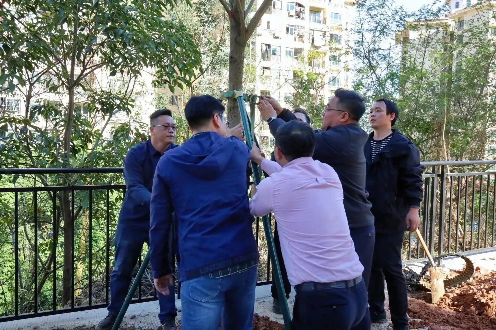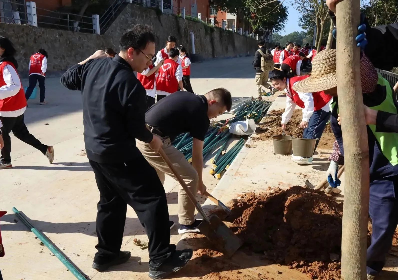 植树现场,华商师生挥锹铲土、扶苗培土、围堰浇水,经过一个多小时的努力,合力种下紫花风铃树苗和四季桂树苗。新种下的树苗迎风挺立,在春意盎然的华商校园里焕发无限生机。