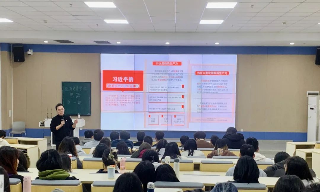 2024年3月5日,经济贸易学院李广明院长在广州校区励志楼C402为经济贸易学院2021级学生讲授以“踔厉奋发,学好本领,积极投身高质量发展的广东实践”为主题的思政第一课。李广明院长以“人勤春来早”开篇,带领同学们学习全省高质量发展大会相关内容,引导同学们学习领会“以高质量发展推进中国式现代化”的深刻内涵。生产力是社会发展的最终决定力量,推进现代化建设最重要的是发展高度发达的生产力。习近平总书记强调发展新质生产力是推动高质量发展的内在要求和重要着力点。新质生产力的特点是创新,关键在质优,本质是先进生产力。
