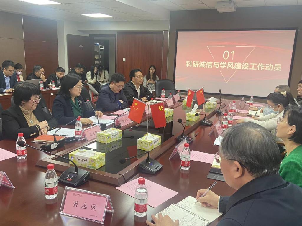 党委书记陈玉欢教授作学校科研诚信与学风建设工作动员。陈书记表示,科研工作是学校最重要工作之一,要充分认识科研诚信与学风建设工作重要性。学校通过开展科研诚信建设活动,教育和引导广大师生恪守学术道德,增强科研诚信意识,坚守科研诚信底线,坚决遏制学术不端行为,自觉弘扬新时代科学家精神,营造求真务实、淡泊名利、潜心研究、水到渠成的良好学术生态。会上,陈书记就我校科研诚信与学风建设工作目标、任务、方式进行了统一规划部署。她指出,全校师生要凝心聚力,在入学、入职、职称晋升、参与科研项目等重要节点,结合各单位实际通过全员培训、主题研讨、案例宣讲等方式,开展科研诚信教育,一是坚持正面典型引导与反面案例警示教育相结合,大力弘扬新时代科学家精神,发挥优秀科学家模范事迹引领、示范作用;二是建立长效机制,逐步并深入开展机构、制度等自查整改工作;三是树立正确的科研评价导向,突出品德、能力、业绩导向,注重标志性成果质量、贡献、影响,推行代表作评价制度,将科研诚信状况作为各类评价的重要指标,提倡严谨治学,反对急功近利。