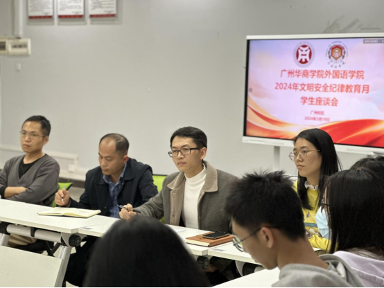 3月19日下午,为深入了解学生的思想、学习、生活状况,充分听取和征求学生对日常教学和管理的意见和建议,外国语学院在广州校区厚德楼B101召开2024年文明安全纪律教育月学生座谈会。外国语学院党委副书记兼副院长陈少鸿老师、学工办副主任何顺发老师、辅导员张超老师、张艳娥老师、江嘉丁老师以及兼职辅导员李怡静、陈冬梅出席本次会议。会议由何顺发老师主持。