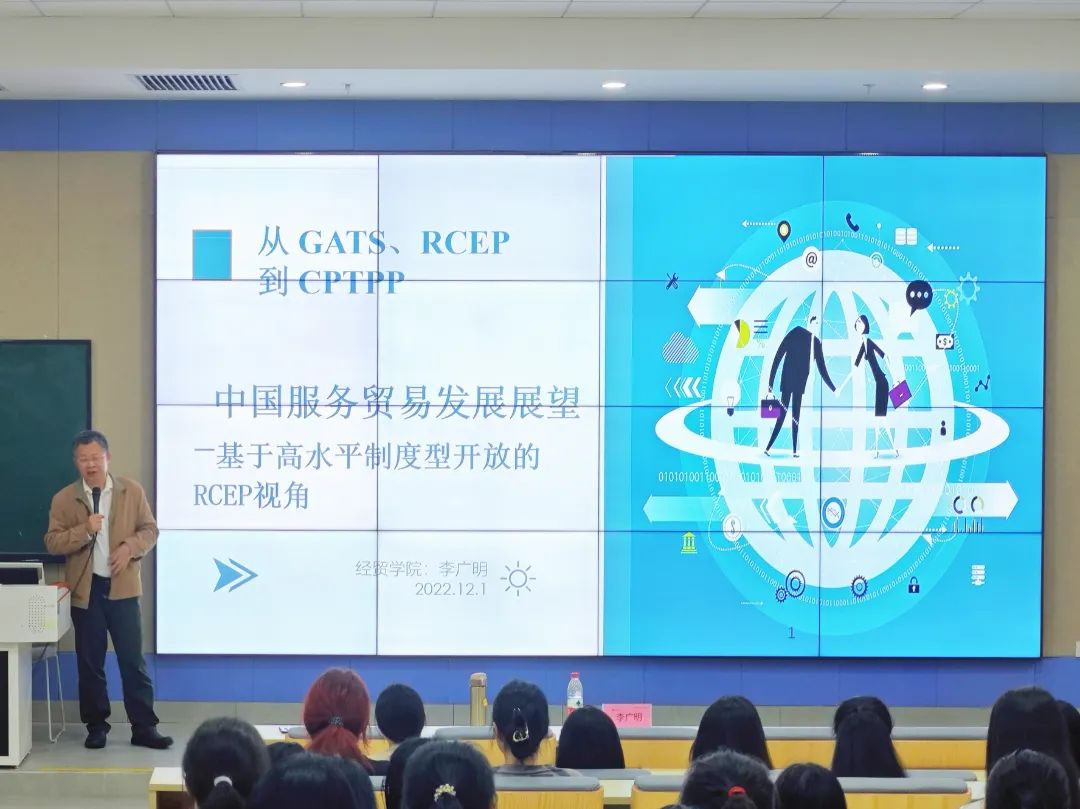 为帮助同学们深入了解中国服务贸易的现状及发展前景,认识RCEP签署所带来的影响,学习高水平制度型开放的重要性,提升专业素养,增强核心竞争力。经济贸易学院院长李广明教授特举办“中国服务贸易发展前景展望——基于高水平制度型开放的RCEP视角”主题讲座,深入剖析中国服务贸易的发展现状、机遇以及未来可能面临的挑战。本次讲座于2024年3月25日15:50在肇庆校区8号楼109举行。