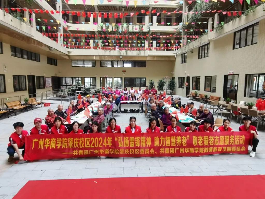 四会市春晖优品养老中心为我校团委、教师教育学院团委颁发“弘扬雷锋精神 传递爱心力量”锦旗,以表达对华商青年志愿者志愿服务的肯定与支持,以及温暖老人内心的善行善举的感谢。
