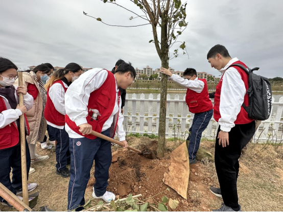 春回大地万物复苏,植树添绿正当时。2月27日下午,增城区总工会联合荔湖街在太平都市农业公园开展“携手添新绿,共植职工林”广州职工公益林增城片区2024年首场植树活动。为深入学习贯彻彻习近平生态文明思想,助力省“百千万工程”和绿美广东生态建设,引领华商青年担当力行、服务社会,我校团委组织10余名学生志愿者参与本次活动。