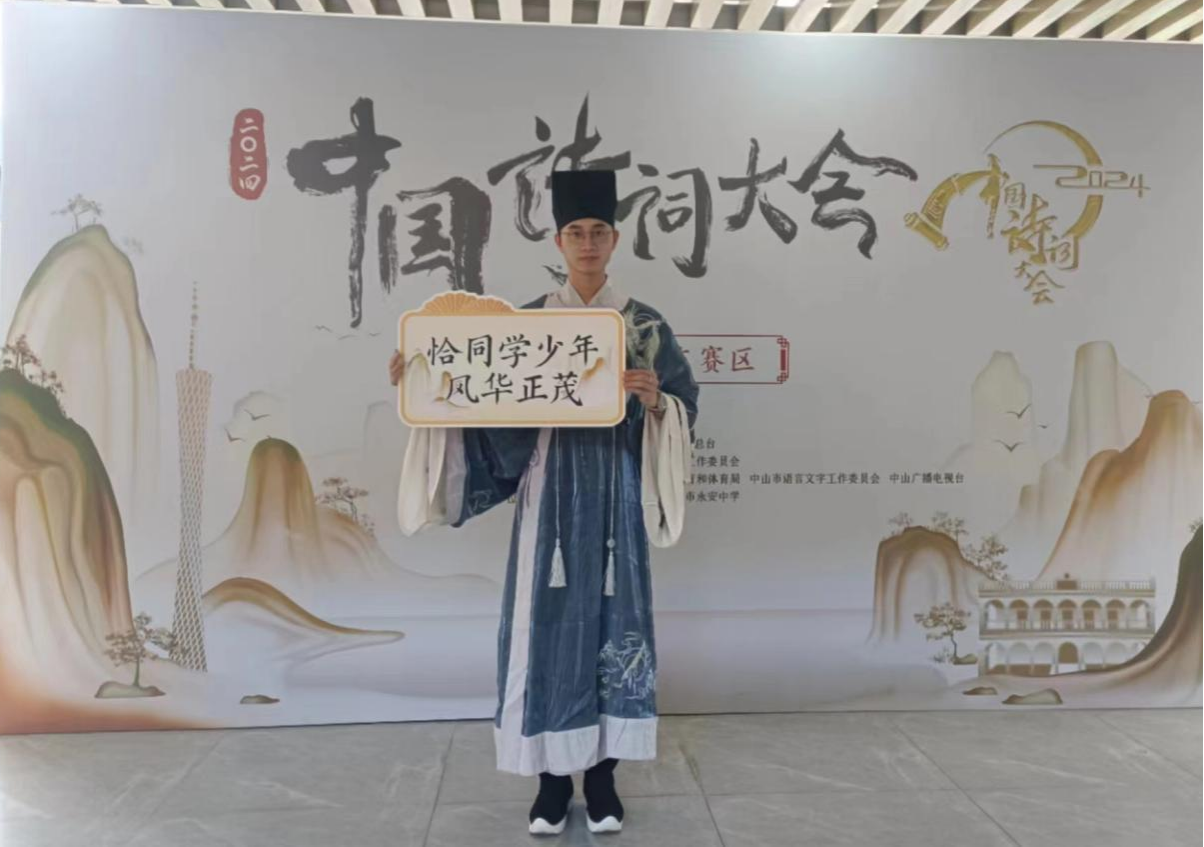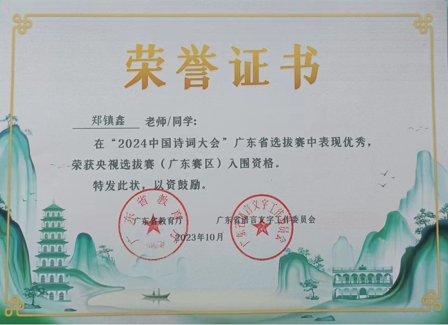 经过广东赛区的层层选拔,郑镇鑫同学从广东赛区200强中脱颖而出,于2023年12月收到中央广播电视总台《2024中国诗词大会》节目录制的邀请,作为线上百人团选手全程参与了2024年1月10期节目的录制。