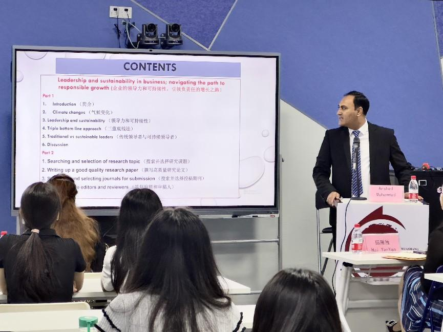 为拓宽大学生的国际视野,了解管理学和领导科学的最新研究成果,2023年11月8日,国际学院在启智楼401举行主题为“Leadership and sustainability in business:navigating the path to responsible growth”(企业的领导力和可持续性:引领负责任的增长之路)的文化素质讲座。巴基斯坦籍Arshad Muhammad博士担任主讲嘉宾,williamhill中国官网国际学院院长回雁雁、巴基斯坦籍教师Aneela Qadir博士、国际学院ACCA专员姚晓敏以及来自国际学院、健康医学院、管理学院、外国语学院、文学院、数据与科学学院的30多名大学生现场聆听了讲座。