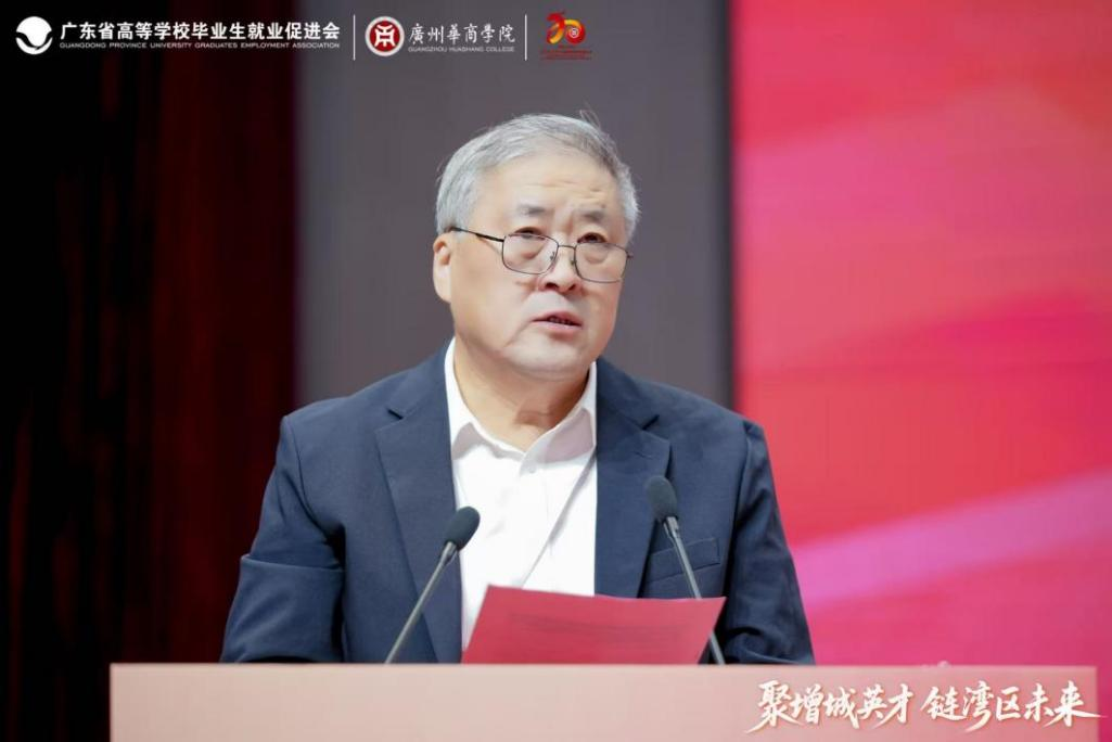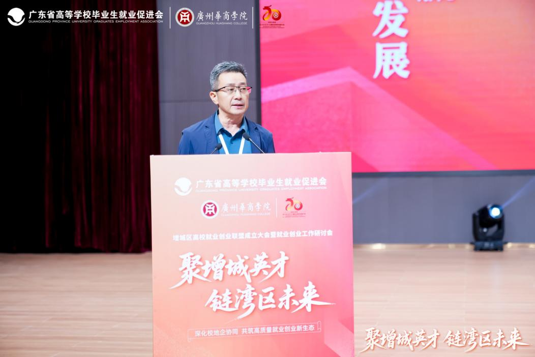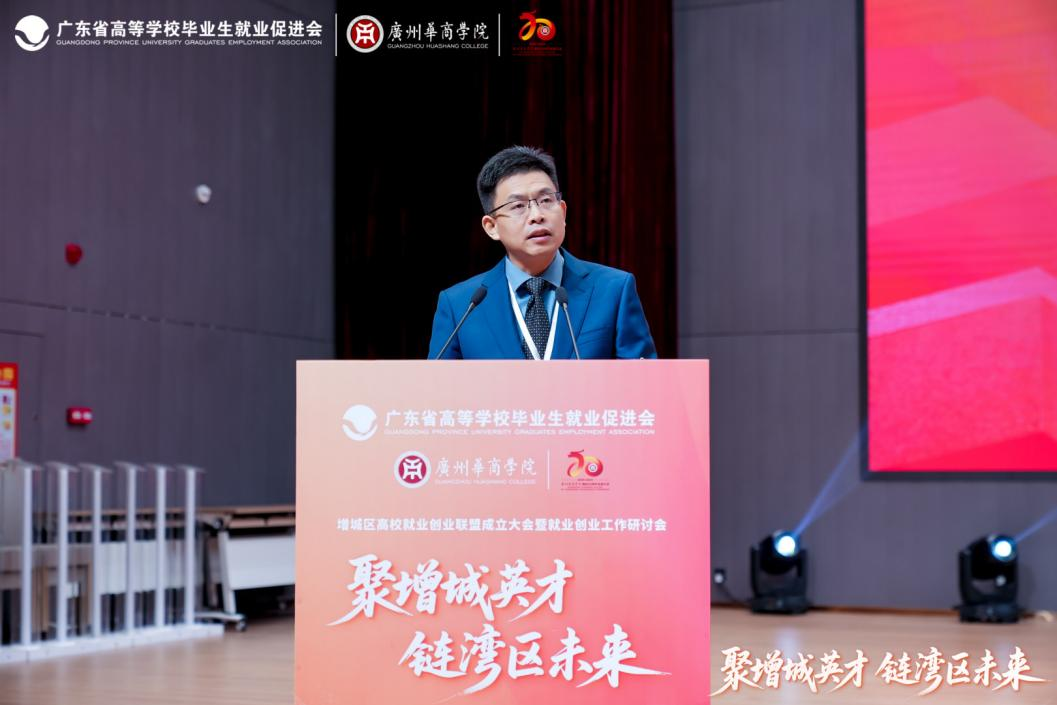 胡军校长代表联盟牵头单位致欢迎辞。他表示,联盟的组建是对国家人才强国战略与创新驱动发展理念的积极响应,联盟将通过构建“政校行企”四方联动的协同机制,打通信息壁垒,促进教育链、人才链、产业链、创新链的有机衔接。他强调,联盟不仅是促进毕业生更高质量、更充分就业的关键举措,更是为增城区乃至粤港澳大湾区的经济社会发展注入可持续人才动力的重要布局。