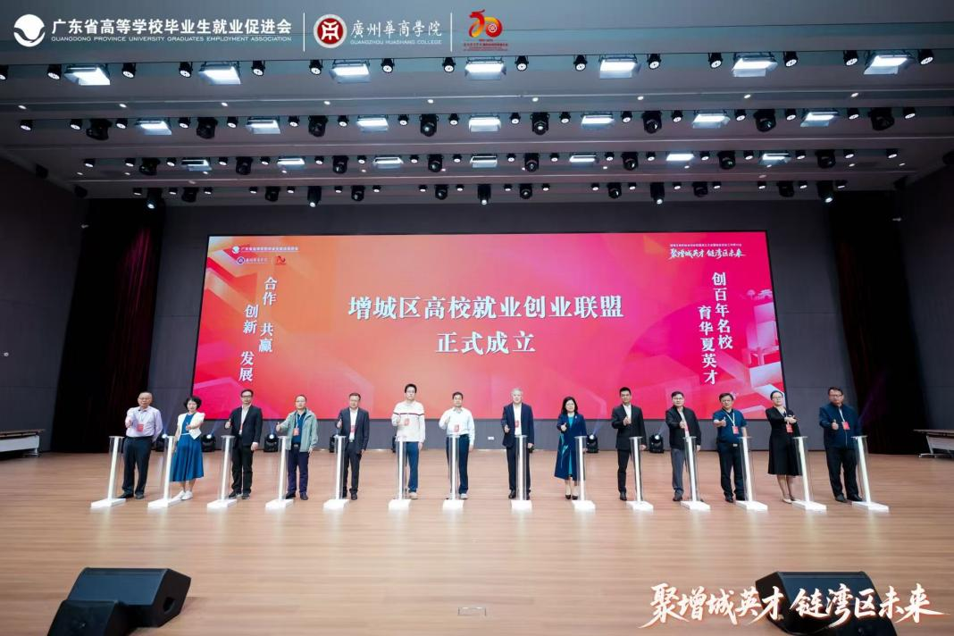 在与会人员的见证下,邱克楠会长、王剑辉副部长、胡军校长、陈玉欢书记及各成员院校代表共同按下启动装置,标志着“增城区高校就业创业联盟”正式成立。