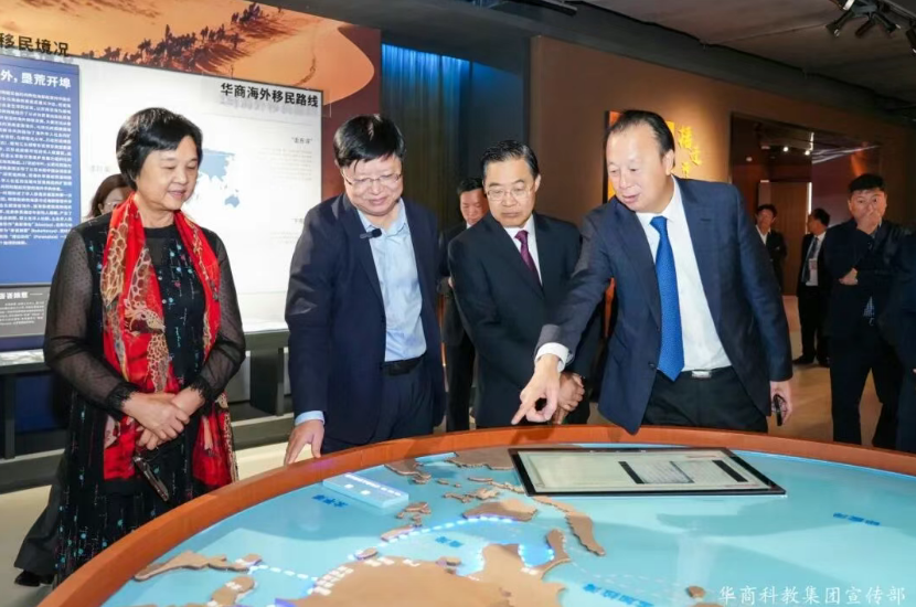 在世界华商博览馆门口,廖榕就董事长特别介绍了自己二十年前以“华商”为名创办学校的缘由。廖榕就董事长认为,“华商”不仅仅是个人、更是一个群体、一个统称。华商会议展览中心正是要突出“世界的华商,华商的世界”这一理念,将华商的精神实质与文化内涵娓娓道来。