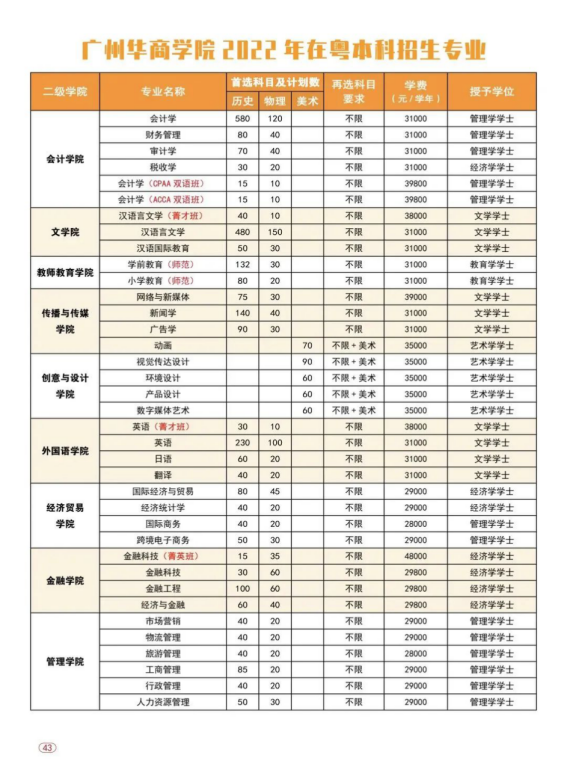 2022年williamhill中国官网(原广东财经大学华商学院)面向广东、安徽、江西、河南、广西、海南、云南、新疆等8个省区招收普通高考生,招生专业45个,招生计划5800人,其中广东省5608人,省外192人。