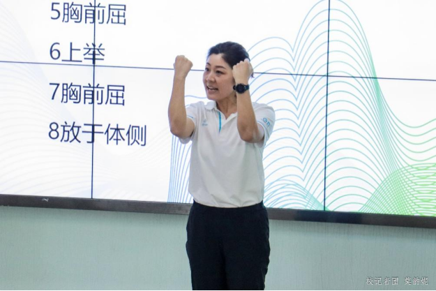 朱宁宁老师以寓教于乐的教学方式,带来了以“第三套全国健美操大众锻炼标准一级套路组合Ⅰ”的主题授课。通过示范教学法、言传身教并行的方式,围绕健美操的第一组八拍动作做了生动而详细的讲解和示范,且在教学过程中不断加以鼓励,使学生感受到运动的愉悦感和成就感,实现了课堂与学生的同频互“动”。