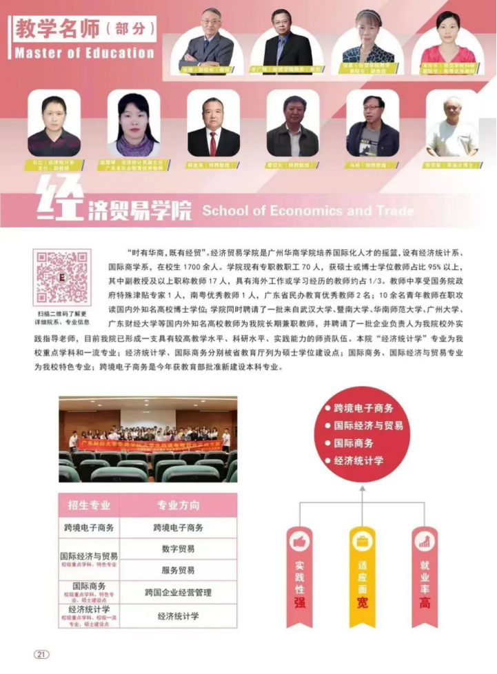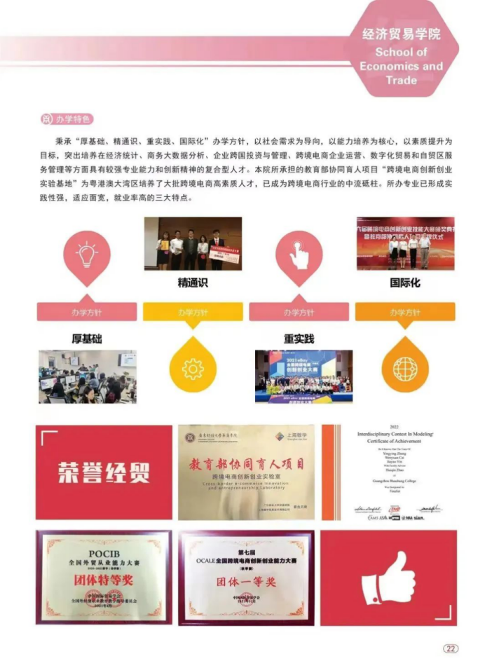 秉承“厚基础、精通识、重实践、国际化”办学方针,以社会需求为导向,以能力培养为核心,以素质提升为目标,突出培养在经济统计、商务大数据分析、企业跨国投资与管理、跨境电商企业运营、数字化贸易和自贸区服务管理等方面具有较强专业能力和创新精神的复合型人才。本院所承担的教育部协同育人项目“跨境电商创新创业实验基地”为粤港澳大湾区培养了大批跨境电商高素质人才,已成为跨境电商行业的中流砥柱。所办专业已形成实践性强,适应面宽,就业率高的三大特点。