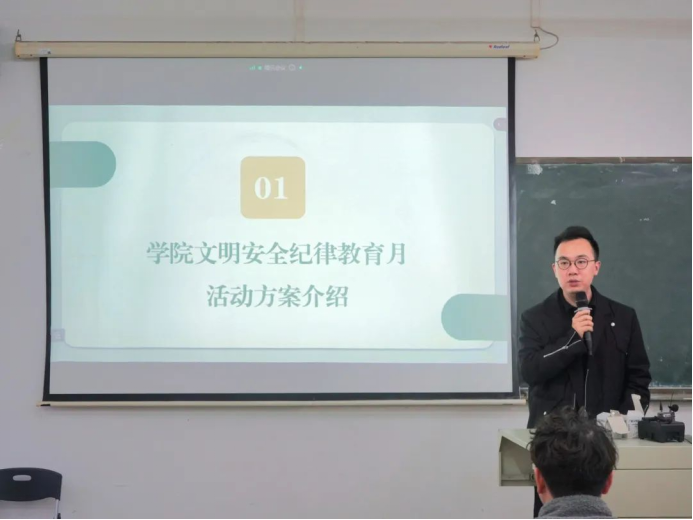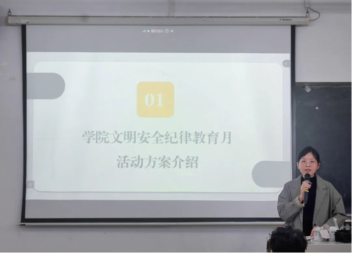 大会伊始,刘龙真老师根据学校教育月文件精神,介绍了学院文明安全纪律教育月活动的方案。刘龙真老师重点介绍了本次纪律教育月活动的总体安排,主要分为工作部署、宣传动员、检查落实、总结表彰四个阶段,就各阶段的具体工作安排进行了详细的介绍,并强调了各学生组织和各班级需根据方案的具体内容严格执行和落实。
