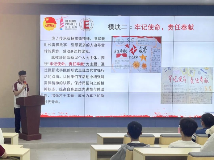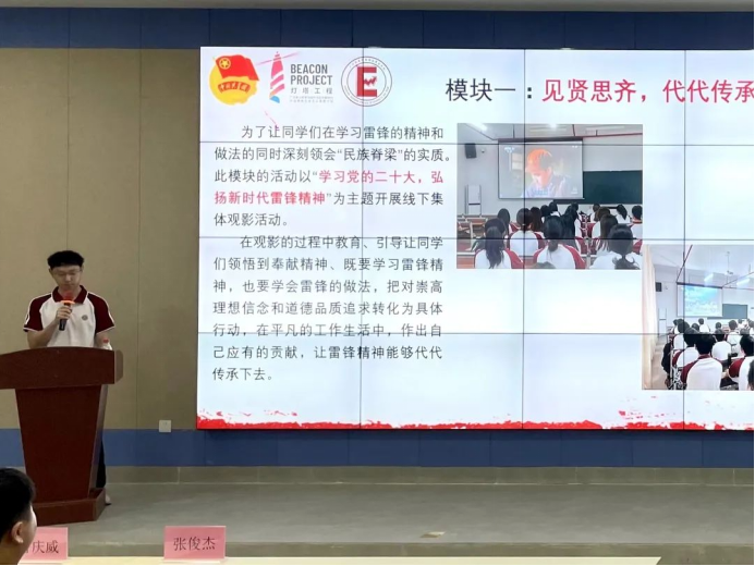 首先是模块一“见贤思齐,代代传承”的介绍,本次活动以班级线下集体观影的形式展开,并写下观影心得。此次活动旨在在观影的过程中教育、引导让同学们领悟到奉献精神。既要学习雷锋精神,也要学习雷锋行动,把对崇高理想信念和道德品质追求转化为具体行动,以实际行动书写新时代的雷锋故事。