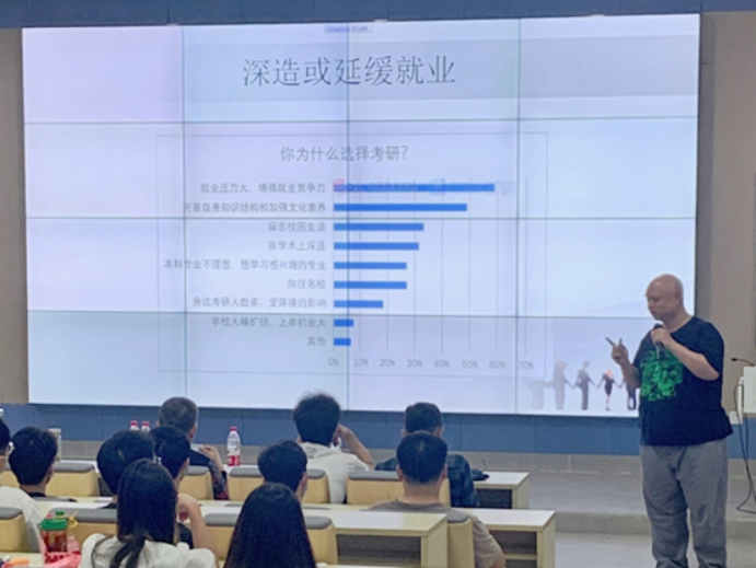 对于考研考公,张教授为我们进行了考研与考公的情势分析,并对大学生选择考研的原因进行了统计分析,其中因“就业压力大,想增强就业竞争力”与“想要完善自身知识结构和加强文化素养”而选择考研的大学生占据大多数,因此考研人数每年都会增加,竞争力也会随之增大。张教授鼓励同学们应该先提高自主学习能力,主动学习、不断增长自己的才干,通过不断探索挖掘自我潜力从而提高自身的竞争力。