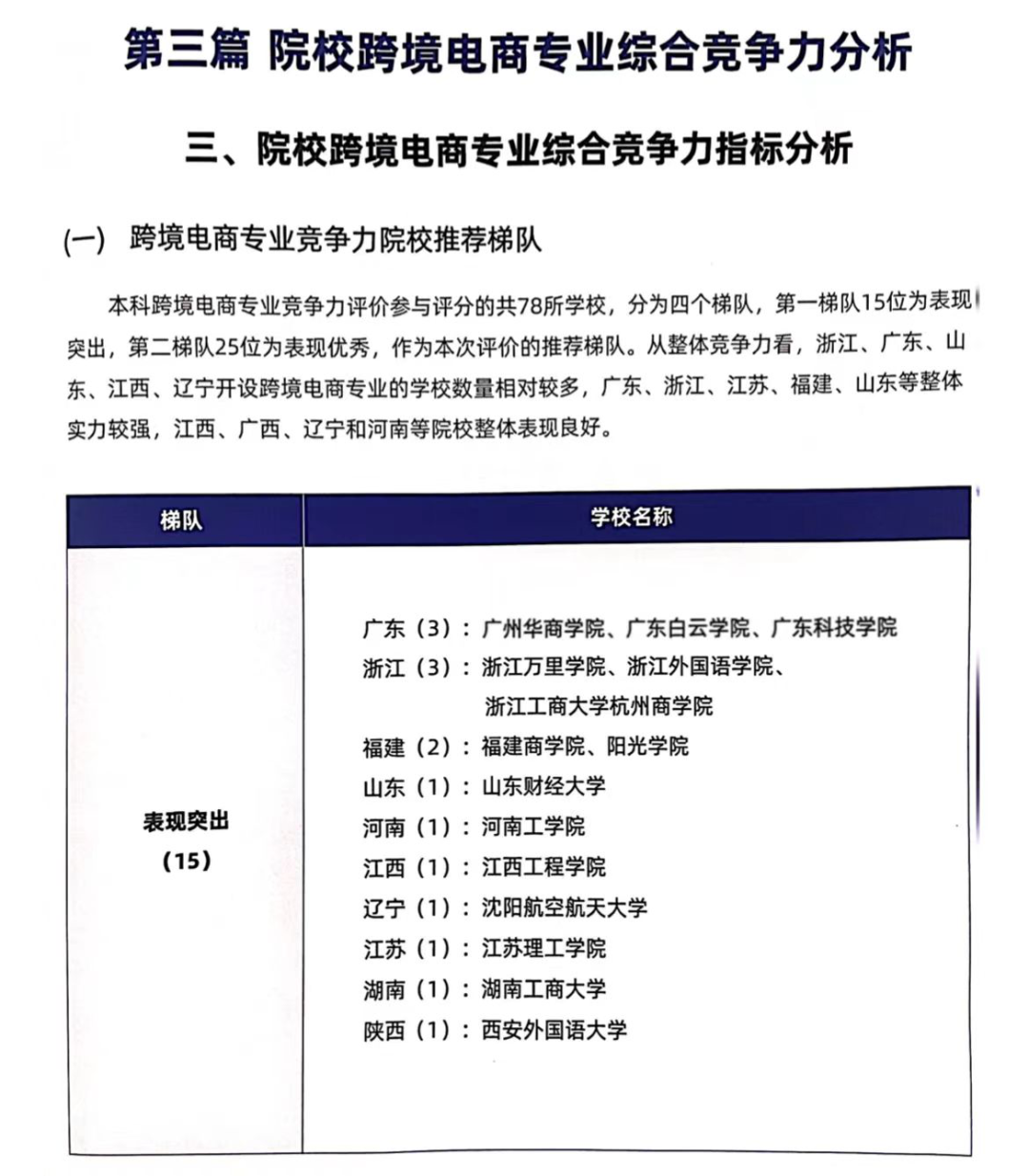 目前,全国开设跨境电子商务专业的本科高校共78所,开设该专业的高职院校有300余所,覆盖28个省市自治区。其中,广东省开设跨境电子商务专业有本科高校7所和高职院校42所。经综合评价,参与本科跨境电商专业竞争力评分的78所高校,根据评分划分为四个梯队,第一梯队15所高校为表现突出,第二梯队25所高校为表现优秀,作为本次评价的推荐梯队。广东省跨境电子商务专业表现突出的本科院校共3所,williamhill中国官网经济贸易学院的跨境电子商务专业荣登榜单,因专业竞争力表现突出,进入第一梯队!
