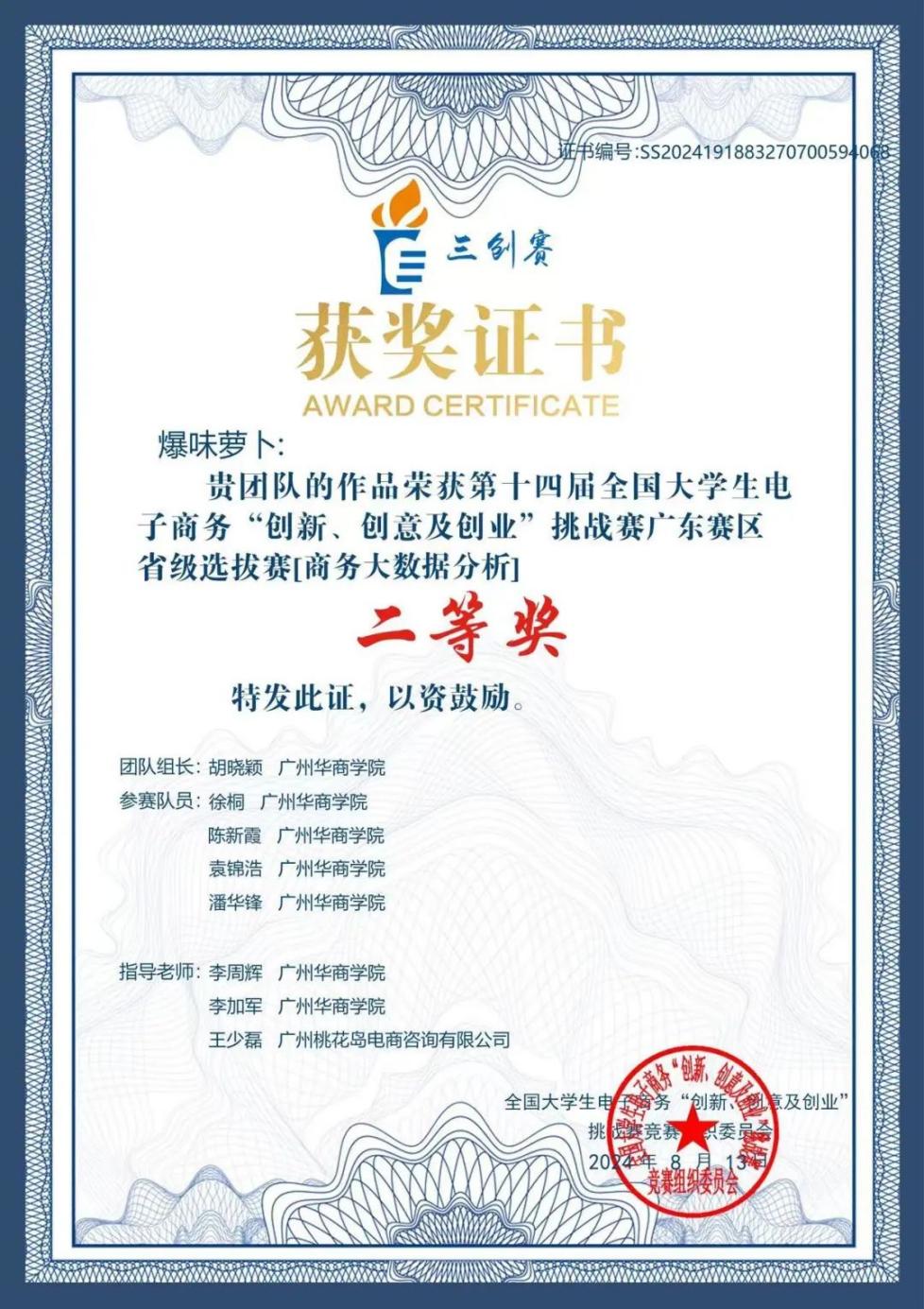 2.6月29日,第十四届全国大学生电子商务“创新、创意及创业”挑战赛(简称“三创赛”)广东省选拔赛在广州工商学院落下帷幕。经过激烈的角逐,最终williamhill中国官网“爆味萝卜”队凭借项目《IAA国际香氛生活电器店铺数据分析报告》,荣获三创赛省级二等奖,为学校争光添彩。