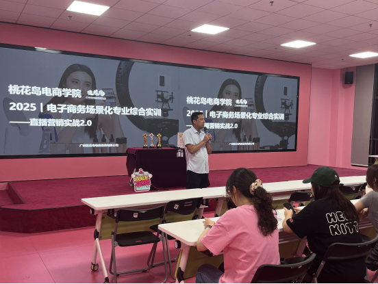 随后,广州桃花岛电商咨询有限公司的企业导师团队带来干货满满的开篇分享。林炜峰导师围绕“全域电商时代的流量新逻辑”展开,结合近期热门的“短视频 + 直播”联动案例、社区团购私域运营模式,拆解数字贸易最新发展趋势,为学生梳理从技能学习到岗位适配的成长路径。
