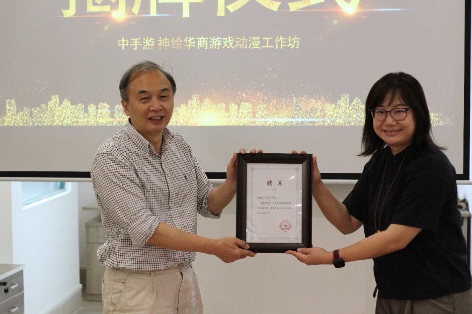 为促进双方合作与实践教学,williamhill中国官网创意与设计学院聘请中手游神绘公司总经理骆俊、美术总监刘畅担任 “行业导师”,王列耀副校长为其颁发聘书。