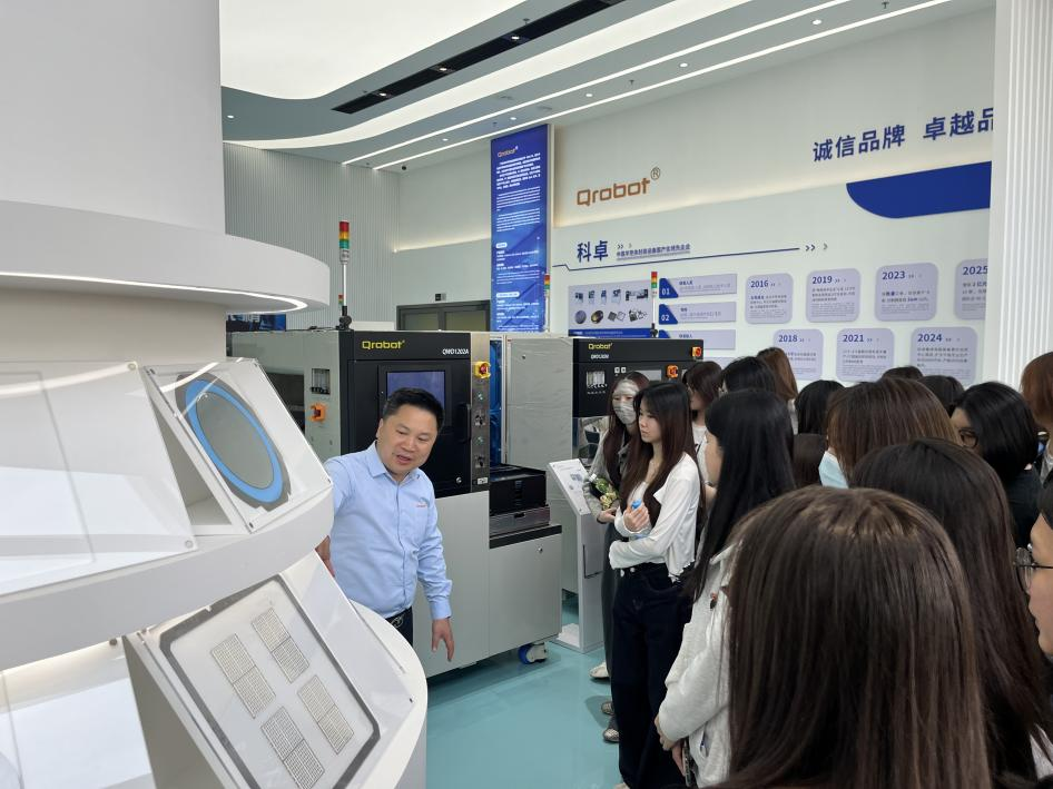 师生实地探访广东科卓半导体设备有限公司的研发中心与生产线,了解国产高端封装设备的创新历程。公司总经理王付国在交流中分享了企业如何在日韩主导的市场中突围,以自主创新推动国产替代,展现了深厚的家国情怀与行业使命感。