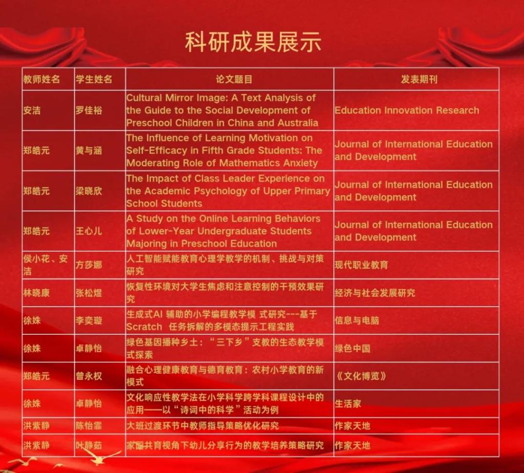 据统计,2024年至今,教师教育学院师生合作已在国内外专业期刊发表论文12篇。其中,国际英文期刊《Education Innovation Research》《Journal of International Education and Development》等平台刊登了多项研究成果,研究领域涵盖数学教育、文化教育比较、教育心理学、人工智能教学等。例如,罗佳裕与指导教师安洁合作,在Education Innovation Research发表《Cultural Mirror Image:A Text Analysis of the Guide to the Social Development Of Preschool Children In China and Australia》,开展中澳儿童社会发展教育比较研究;黄与涵、梁晓欣和王心儿三位学生在导师郑皓元的指导下,分别从学习动机、自我效能、班级领导角色等角度展开小学学生学业心理的实证研究,成果发表于Journal of International Education and Development。通过与教师联合研究,学生不仅掌握论文撰写规范,更在独立思考、批判精神、学术表达等综合能力上获得提升。从提出问题、设计研究工具到收集分析数据,学生逐步成长为具备初步科研素养的“准教育人”。