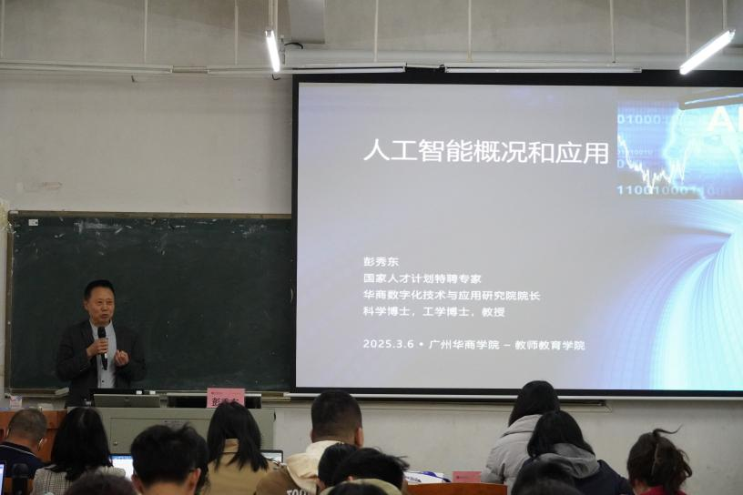 2025年3月6日下午,由教师教育学院主办的“数字化驱动的AI”专题讲座在广州校区励志楼C101教室举行。国家人才计划特聘专家、华商数字化技术与应用研究院院长彭秀东教授作为主讲人,为师生们带来了一场以“数字化驱动的AI”为主题的知识盛宴。