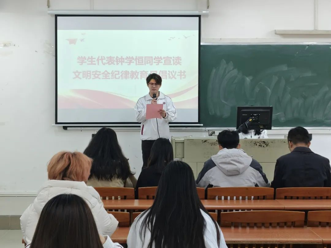 会议伊始,学生代表钟学恒宣读“文明安全纪律教育月”倡议书,倡议围绕三大主题展开:一是“安全为先,守护你我他”,倡导全体学生重视人身财产安全,遵守宿舍安全规范,警惕网络诈骗;二是“文明同行,共建美好校园”,号召师生保持校园环境整洁、文明用语、礼让互助,营造和谐氛围;三是“纪律严明,共创优良学风”,倡导严守课堂纪律,杜绝迟到早退,以自律促学风提升。倡议内容简明务实,现场师生积极响应,为教育月活动拉开序幕。