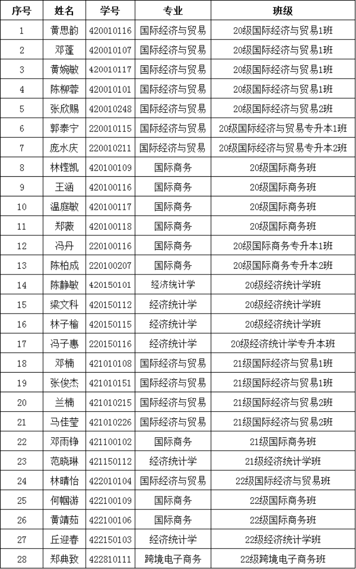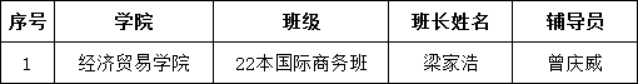 为积极落实我校文明安全纪律教育月活动工作安排,进一步加强和改进学生日常教育管理,增强广大学生纪律观念、安全防范意识,帮助同学们养成良好的学习和行为习惯,形成良好的校风、学风、班风,促进和谐校园建设。经济贸易学院于2023年3月21日至2023年4月21日开展以“严明校规校纪,共创和谐校园”为主题的文明安全纪律教育月系列活动。经过班级内部自主评议和学院综合评定,秉承着公平公正和择优的原则,拟推荐22本国际商务班参评学校“先进班集体”称号,拟推荐黄思韵等28名同学参评学校“先进个人”称号,现将具体名单公示如下: