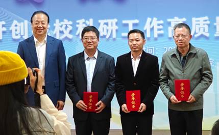 在合影留念之后,荣获“优秀科研工作者”称号的雷钦礼教授作为代表发言。雷教授自身科研成果斐然,在发言中,他情真意切地分享了自己的科研心得。他强调,作为大学老师,肩负着教书育人与科研探索的双重使命,教学与科研相辅相成,缺一不可,需要老师们用心去平衡、去耕耘。他也着重提到了做好科研工作的艰辛,那是无数个日夜的钻研、无数次实验的尝试、无数回思路的推翻与重建,但这一切的付出都是值得的,因为科研成果在学校转设合格评估等重要发展环节中扮演着举足轻重的角色,关乎学校的声誉、未来的竞争力以及对社会的贡献能力。