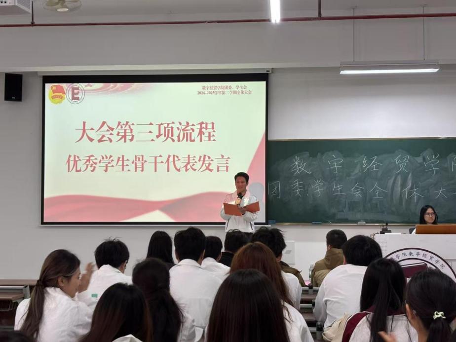 会议第三项议程是优秀学生骨干代表冯晨同学发言,他号召学生骨干以热情与创新投身学院服务,在实践中成长,在奉献中收获。这场发言不仅展现了优秀学生骨干的风采,更为全体成员树立了学习标杆。许多新成员表示,要以冯晨学长为榜样,在服务同学中实现自我成长。