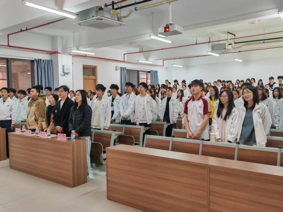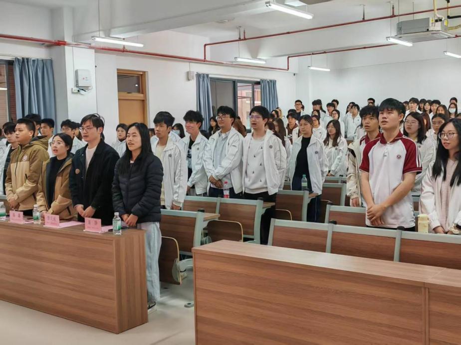 会议第一项议程是与会成员共唱国歌,在肃穆的氛围中,全体师生整齐起立,面向国旗,齐声高唱中华人民共和国国歌。铿锵有力的旋律回荡在整个会场,每一个音符都凝聚着对祖国的热爱与敬意,以饱满的热情展现了青年学子的爱国情怀与责任担当,也正式拉开了本次全体大会的序幕。
