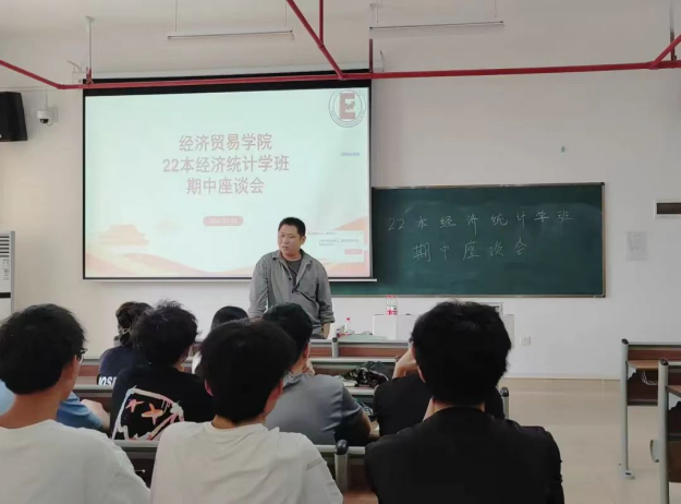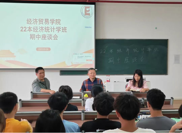 为深入开展学习贯彻习近平新时代中国特色社会主义思想主题教育,坚持立德树人初心,牢记为党育人、为国育才使命,促进经济贸易学院班风学风建设,深入了解四会校区经贸学子的学习情况与校园生活状态,经济贸易学院李广明院长率学院院长助理石立副教授、学工办主任宋元跃老师、各系负责人和教师代表于2023年5月9日前往四会校区,在22级国际经济与贸易班、跨境电商班、国际商务班、经济统计学班分别召开期中座谈会。