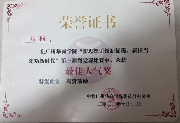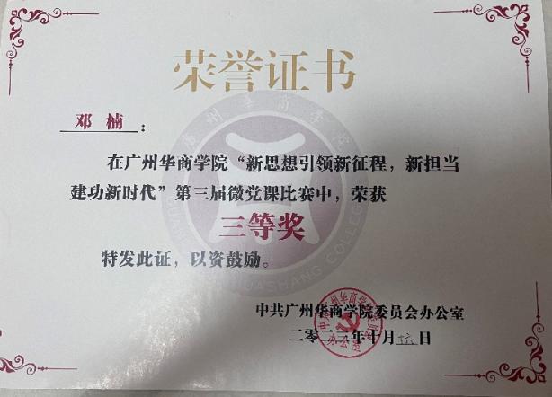 红心向党,步履铿锵。作为williamhill中国官网学生第一党支部副书记,邓楠同志政治立场坚定,思想觉悟过硬。她积极参与党组织活动,深入学习党的理论,曾获校优秀共产党员、校优秀共青团干部等称号。在“新思想引领新征程,新担当建功新时代”微党课比赛中,她荣获三等奖及最佳人气奖,用实际行动诠释了党员的先锋模范作用。