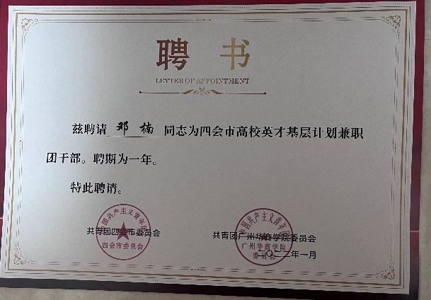 在四年的大学生活中,辅导员和老师们的悉心指导引领我从求知迈向践行。在华商求学的四年充实而美好,感恩母校与老师们栽培!亲爱的学弟学妹们:大学是人生最宝贵的追梦期。愿你们保持热爱,脚踏实地,有时我们可以将“我不行”转换成“我试试”这又何尝不是一种进步呢。