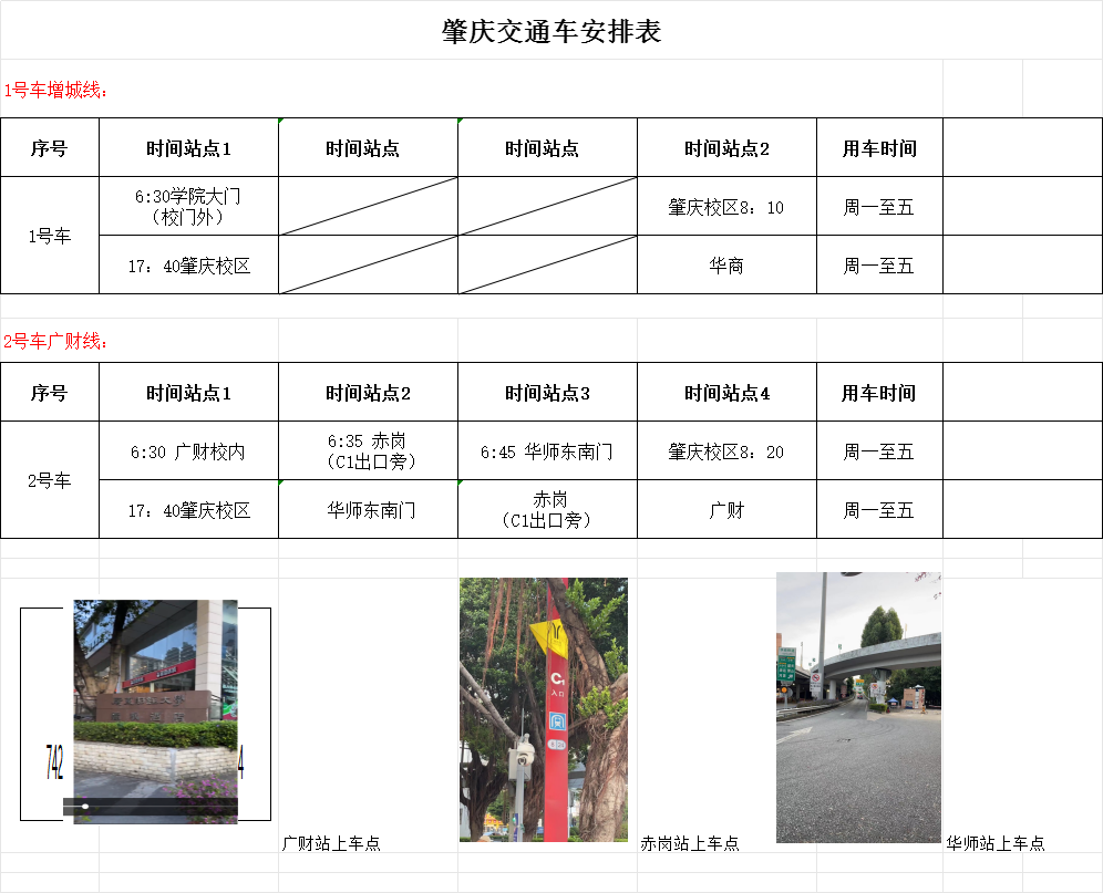 2.广财6:30--赤岗6:35--华师东南门6:45--肇庆校区 ;
