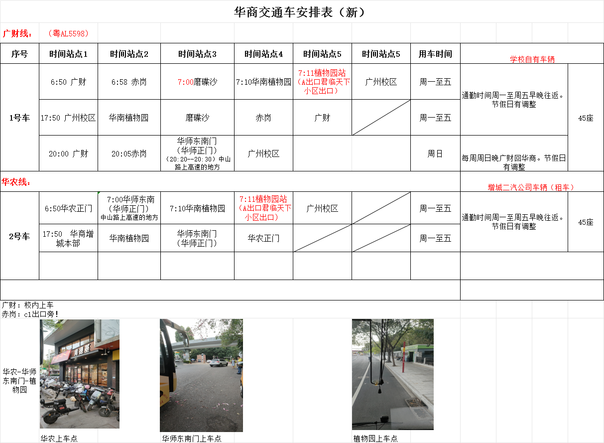 2.华农6:50--华师东南华师正门7:00--华南植物园7:10--植物园站7:11(A出口君临天下小区出口)--广州校区 ;