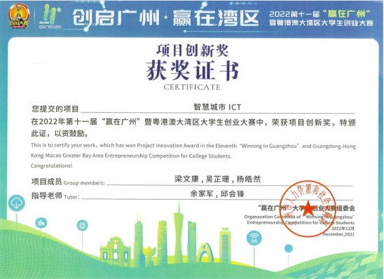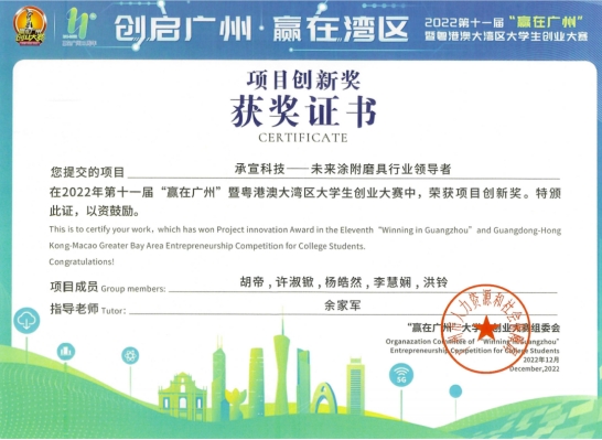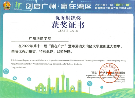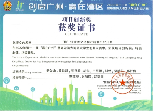 由广州市人力资源和社会保障局主办,中国南方人才市场管理委员会办公室承办的2022年第十一届“赢在广州”暨粤港澳大湾区大学生创业大赛圆满落幕。williamhill中国官网《“榄”住清香之乌榄叶精油产业开发》《稚影传媒——融媒体领域专业服务商》《承宣科技——未来涂附磨具行业领导者》《智慧城市ICT》《藏香阁——中药香水》5个项目均荣获项目创新奖,我校荣获优秀组织奖。