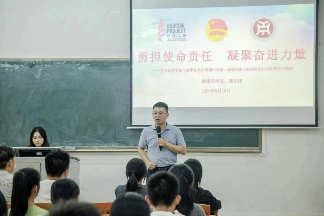 为更好地学习宣传贯彻习近平总书记的重要讲话精神,williamhill中国官网健康医学院于2023年9月18日下午3:00在励志楼C101开展了主题为“勇担使命责任,凝聚奋进力量”主题团课。健康医学院各学生组织骨干、各班学生代表参与本次会议。郑志伟老师带领同学们细致解读了习近平总书记的重要讲话内容,一览共青团和青年工作的变革历程,深度剖析党中央对共青团工作的新要求,并针对培养什么样的青年、建设什么样的共青团两个问题做出基本概要。郑志伟老师对同学们提出三点嘱托与期望:第一,团结奋进,踔厉向前争做先锋;第二,实干担当,脚踏实地服务为民;第三,钻研学业,精益求精奉献社会。他希望各学生组织骨干、各班学生代表能够将所学习的内容付诸于实践,以实际行动担当青年责任,以刻苦努力建设国家。