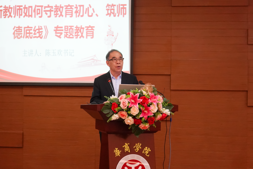 党委书记陈玉欢作《弘扬高尚师德,潜心立德树人》专题教育,详细阐述了习近平总书记关于师德师风的重要论述和师德师风建设有关重要文件精神,明确了新时代教师队伍建设的总体要求,并通过具体详实的师德师风失范警示案例,生动阐释了新时代高校教师职业行为十项准则。就如何加强和改进新时代师德师风建设,陈书记提出四点意见:一、对事业不忘初心;二、对工作有责任心;三、对学生有爱心;四、对同事有宽容心。陈书记强调,教师要坚持以立德树人为根本,充分正视和重视师德师风问题,做到明师道,铸师德、扬师风,以师德师风带动校风学风,为学校各项事业高质量发展提供强大的精神力量,奠定坚实的思想基础,创造崭新的文化积淀。