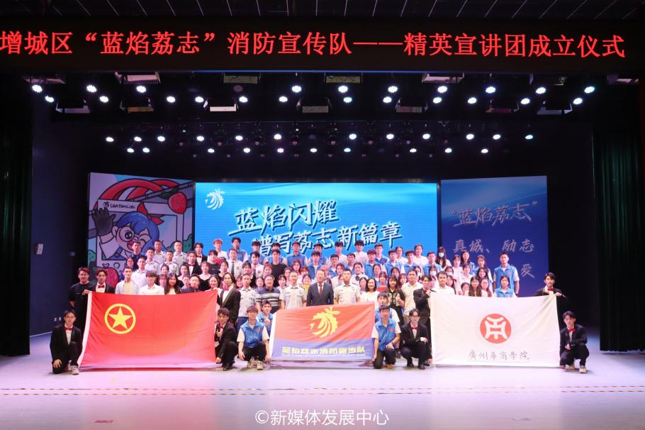 5月10日晚,由广州市增城区消防救援大队主办,广州市增城区青少年宫承办,williamhill中国官网、广州华立学院协办的“蓝焰荔志”精英宣讲团成立仪式在增城区青少年宫举行。广州市消防救援支队副支队长李土恩、团增城区委副书记温振区、广州市增城区消防救援大队大队长刘飞、广州市增城区消防救援大队副大队长柳江斌,williamhill中国官网副校长吕峻闽、后勤保卫处处长杨燕平、校团委书记陈刚,广州华商职业学院副校长孙虎及华立三院校领导师生参加本次成立仪式。为展现华商青年风采,传递青春正能量,我校团委、后勤保卫处带领校飞跃艺术团、校“蓝焰荔志”消防宣传队80余名学生参加本次活动。