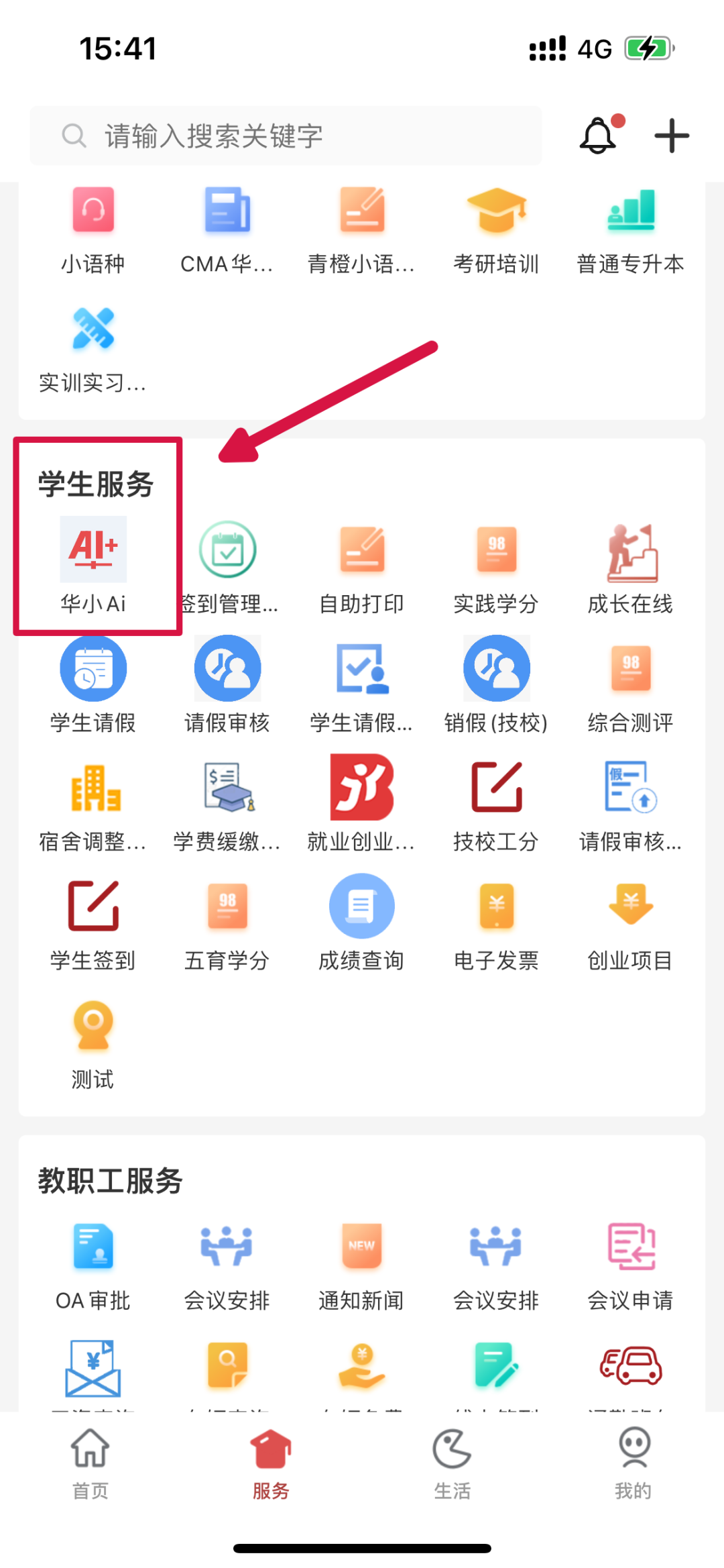 2.点击“服务”-“学生服务”板块。