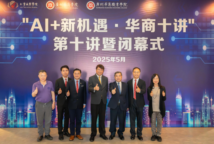 印国庭先生作总结讲话。他表示,“AI+新机遇·华商十讲”虽已落幕,但华商科教集团探索前沿、服务社会的初心永不褪色。集团将继续秉承培养“德智体美劳全面发展,专业基础扎实,具有国际视野、创新精神和较强实践能力的高素质应用型人才”的目标,推出更多优质学术活动,助力学子成长,赋能湾区乃至国家的科技与经济腾飞。