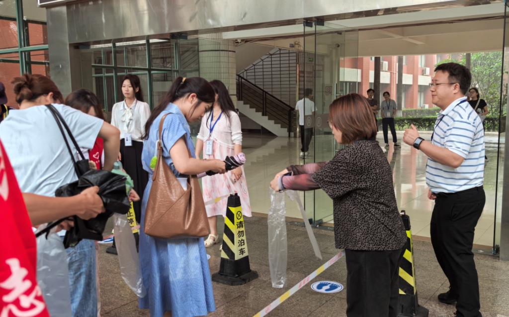 考场内,我考点设置指引标识、展架海报、纸巾用水及特殊考生服务点;安排工作人员、志愿者积极答疑,引导考生快速入场候考;配备专职医护人员,准备常用药品、轮椅等,全程为考生提供医疗保障服务;受雨天影响,考场入口提前搭好遮雨棚,考务室为面试官和考生准备吹干衣物的风筒;考场外,交警部门全力保障考点交通秩序,为考生保驾护航。
