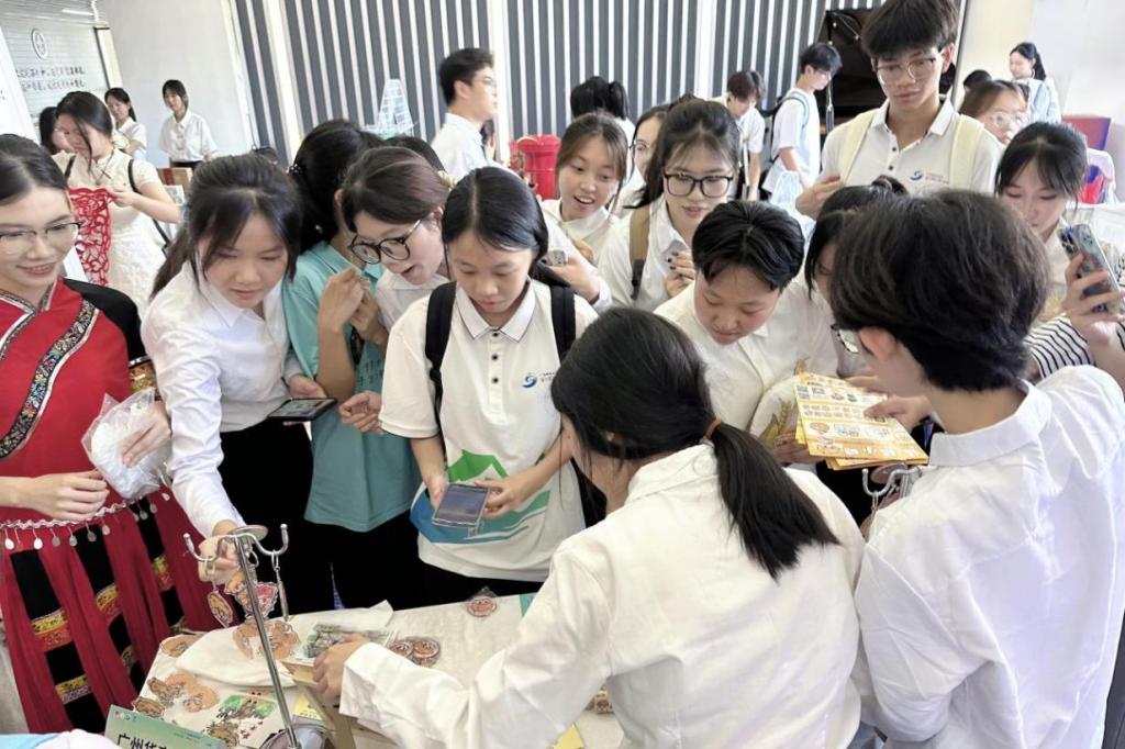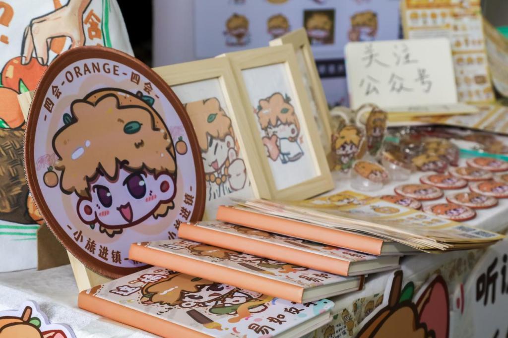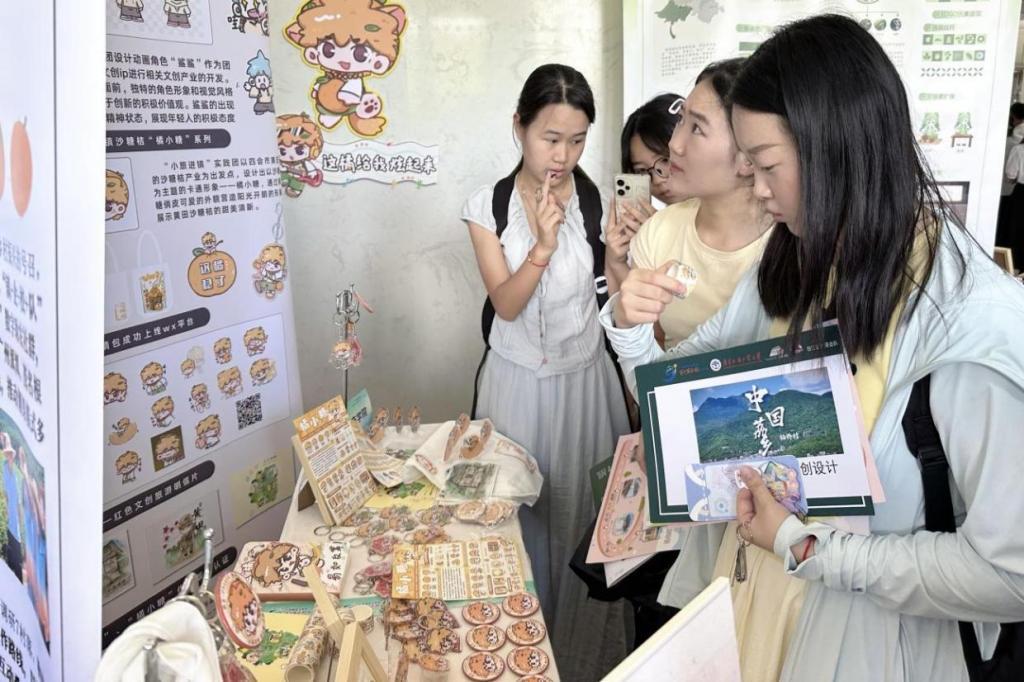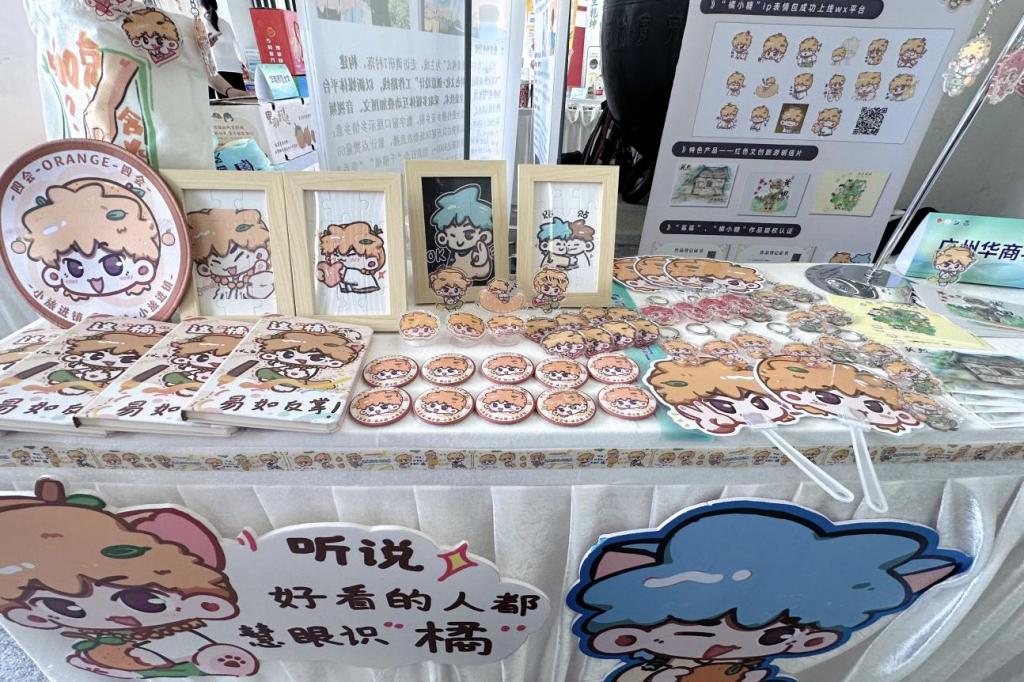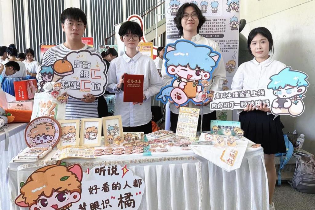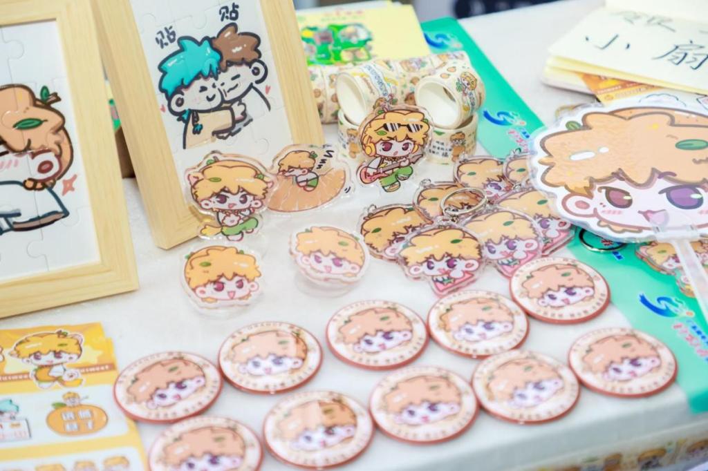 在竞赛成果展区,“橘小糖”IP以鲜明的视觉体系和实用场景覆盖力脱颖而出。团队精心布置文创矩阵展台。各省内高校参赛队伍纷纷前来交流,展台前一度排起长龙。师生们现场领取钥匙扣、胶带、笔记本等周边产品,手持“橘小糖”IP衍生品爱不释手。