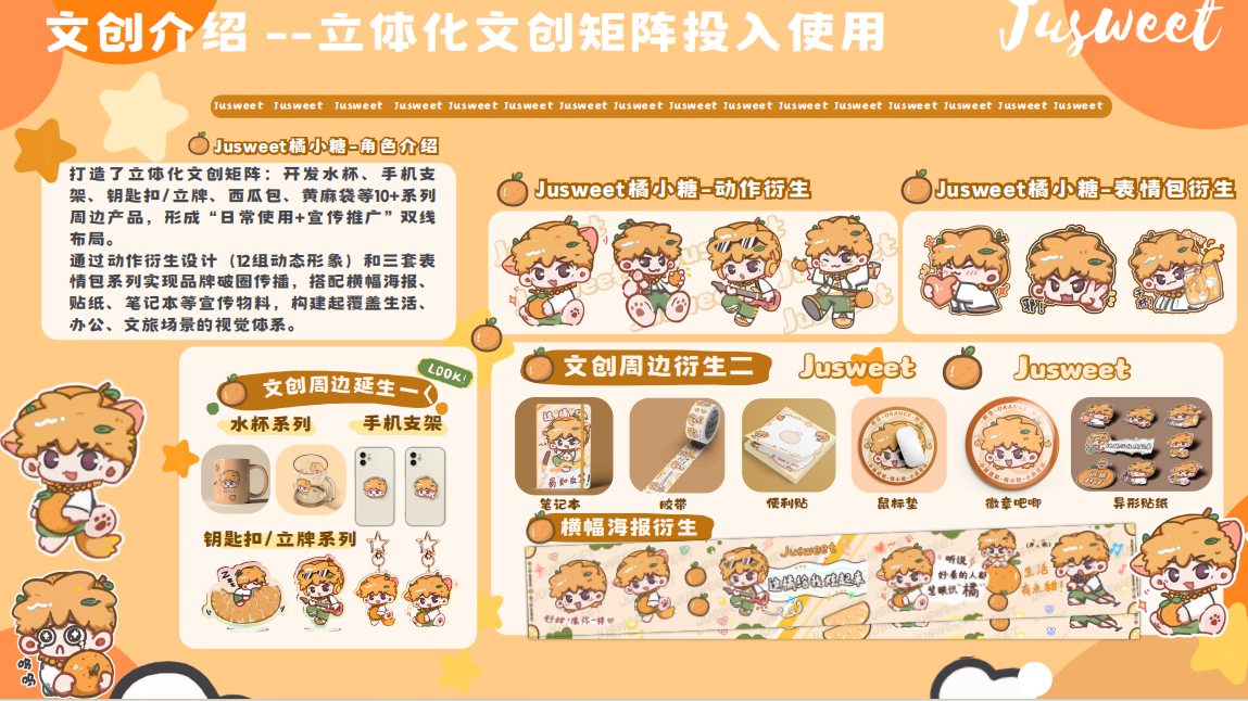 来自数字金融学院的项目团队负责人史梓健同学介绍,“橘小糖”通过拟人化设计,将沙糖桔的天然甜美与青年活力融合。数字化大眼睛设计传递产业与年轻消费群体的对话感,可拓展肢体动作更预留了包装、文旅衍生品等创意空间。目前,该IP已开发出手机支架、钥匙扣等周边产品,助力沙糖桔从单一农产品升级为融合生态旅游与非遗文化的复合型载体。