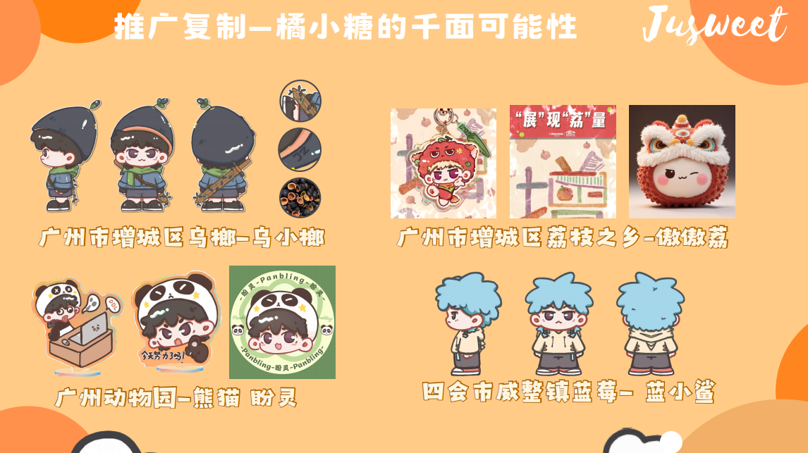 本次竞赛聚焦文化传承与科技创新,参赛作品涵盖文创产品设计、文旅路线规划等多元领域。其中,“橘小糖”实践团以“甜美产业青春赋能”为核心理念,为四会市黄田镇沙糖桔产业量身打造了IP形象“橘小糖”,突破传统农产品形象边界,构建起“农产品-地域文化-消费情感”的独特符号。