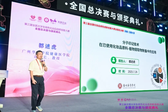 此外,健康医学院都述虎副院长在会上作《分子印记技术在已使用化妆品原料-植物提取物制备中的应用》研究分享,详细介绍该技术的原理、应用路径及前沿成果,包括提升原料纯度与活性、降低生产能耗等方面的突破。其分享为在场嘉宾带来新的研究视角,深化了产学研领域的学术共鸣,助力相关技术从实验室更快走向产业应用。