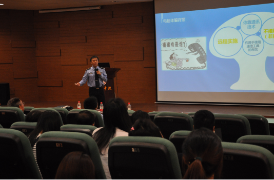 接着,徐睿智警官以“电信诈骗碎碎念”为题,从电话诈骗、短信诈骗和互联网诈骗三个方面,全面地讲解了电信诈骗的种种招数。本次讲座的课件内容十分丰富,穿插了动画和视频,生动形象地传达了安全教育知识,大家受益匪浅。讲座结束后,辅导员提出问题,与徐睿智警官交流互动。
