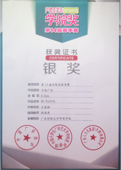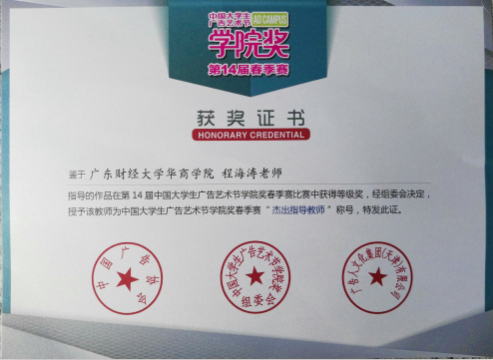 7月28日,华商文学院艺术设计学系万爱婵同学的设计作品在全国1200多所院系师生的138889件作品中脱颖而出,获得第十四届学院奖银奖,指导老师程海涛荣获“杰出指导老师”称号。万爱婵设计团队也受中国大学生广告艺术节学院奖组委会邀请,赴北京中央电视台参加的颁奖典礼。