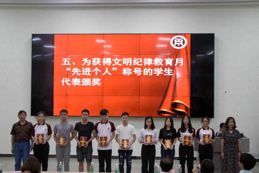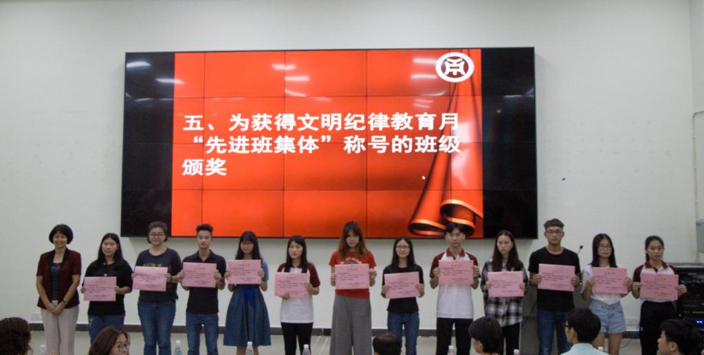 刘苗副书记宣读《关于表彰2018年文明安全纪律教育月活动中先进集体和个人的决定》。接着王锦秀副院长为获得“先进班集体”称号的班级颁奖;李希恒处长、吕书勉副主任为获得“先进个人”称号的学生代表颁奖。